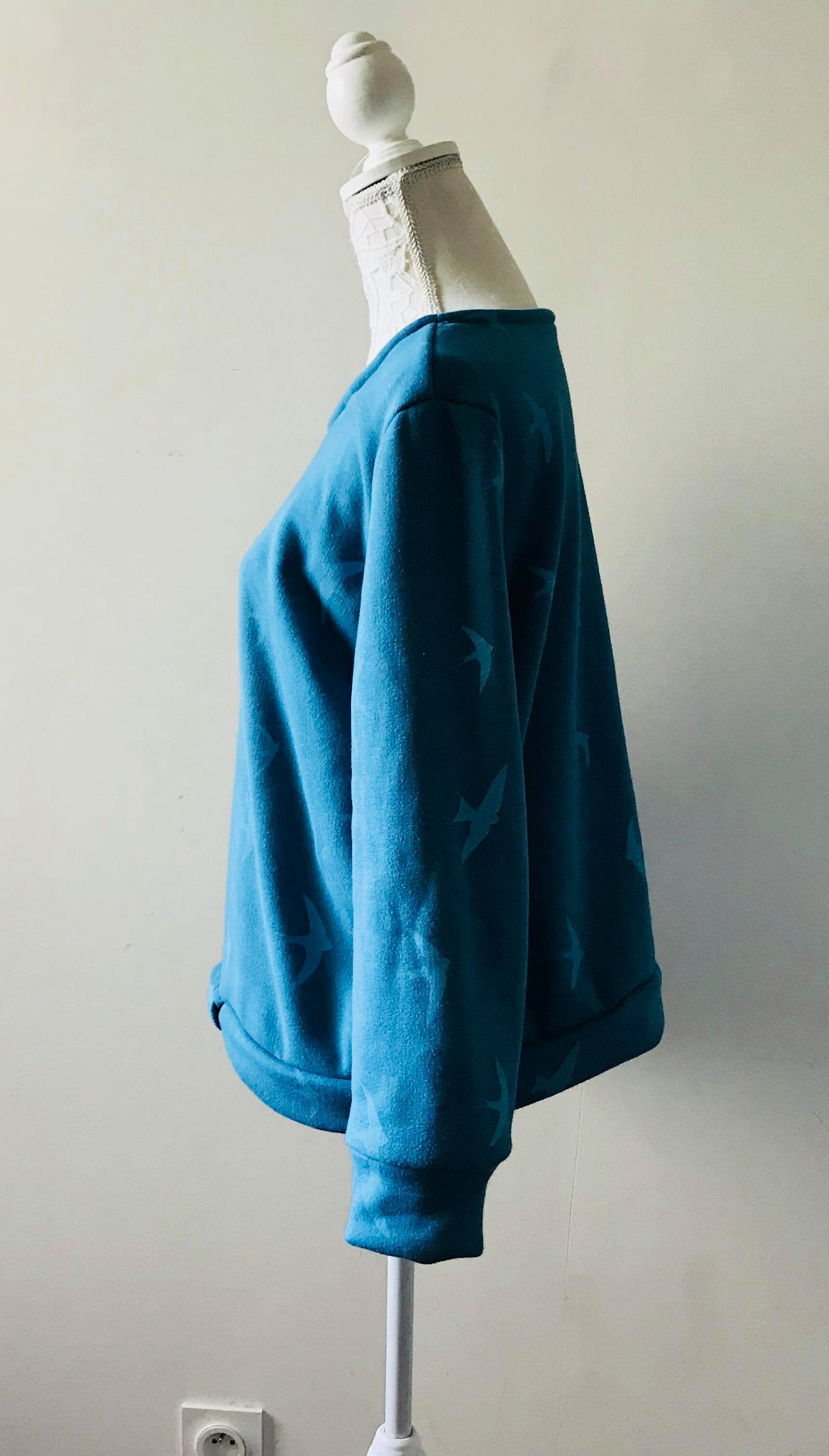 so sweet sweat delphine et morissette couture patron tissu bleu motif oiseau vieille morue 7