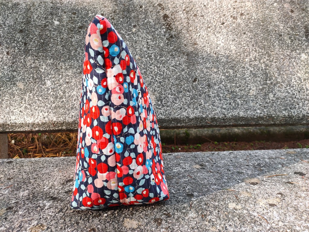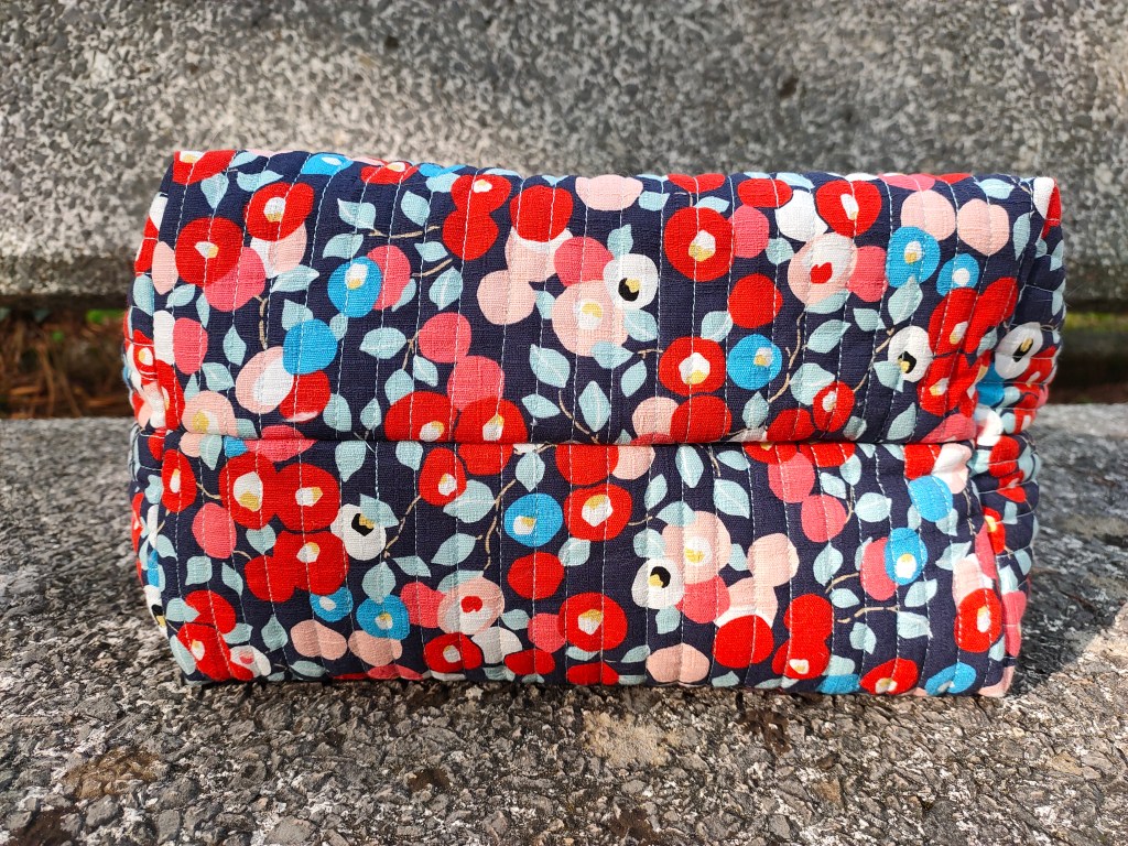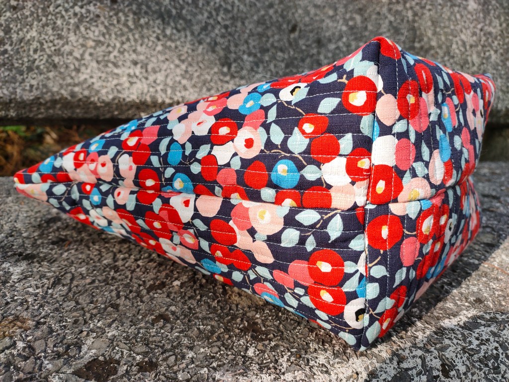 Comme dans ma première version, j’ai choisi de matelasser mon tissu tous les centimètres avec un fil du même bleu clair que les feuilles. Ca lui donne une belle tenue (les lignes de piqure maintiennent bien le tissu principal et le molleton), et lui apporte un certain chic. Et vous, qu’en pensez-vous ?!