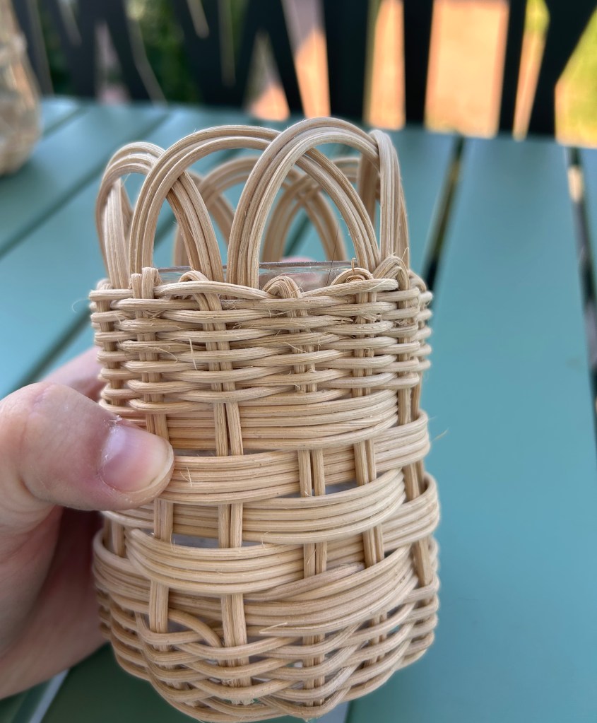 Le petit pot est très « intuitif », je dirais. Fond en croisillon également, tressage en super puis j’ai voulu tester une technique différente en faisant passer quatre brins sur deux groupes de montants.