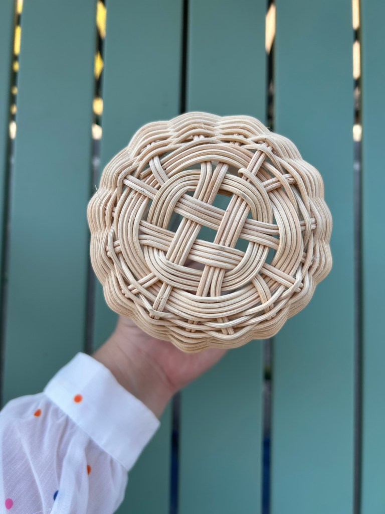 Après un un centre en croisillon, j’ai travaillé un tressage simple en super et j’ai progressivement incurvé les montants en resserrant l’ouvrage pour obtenir une forme creuse. Pour finir, j’ai rentré les montants dans l’espace des montants suivants. Ça donne des festons très ajourés, j’adore cette finition.