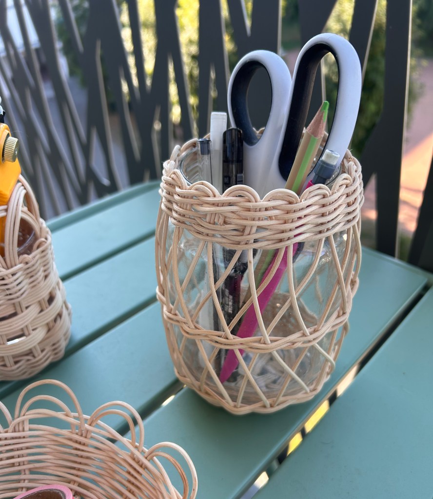 L’astuce, pour se faire des pots à crayon, c’est de travailler son rotin autour d’un pot en verre. On bénéficie ainsi d’un support régulier pour le tressage, mais surtout d’un lest indispensable pour que l’ouvrage tienne debout malgré le poids des stylos. Le verre permet de jouer avec la transparence et apporte un certain charme bohème !
