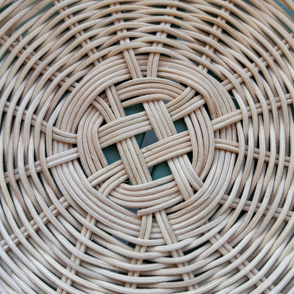 J’ai probablement mal géré ma tension que je donnais à mon rotin à ce moment-là, le pot est légèrement cintré dans cette zone. Puis retour au tressage en super pour la symétrie, et festons à nouveau pour les finitions.